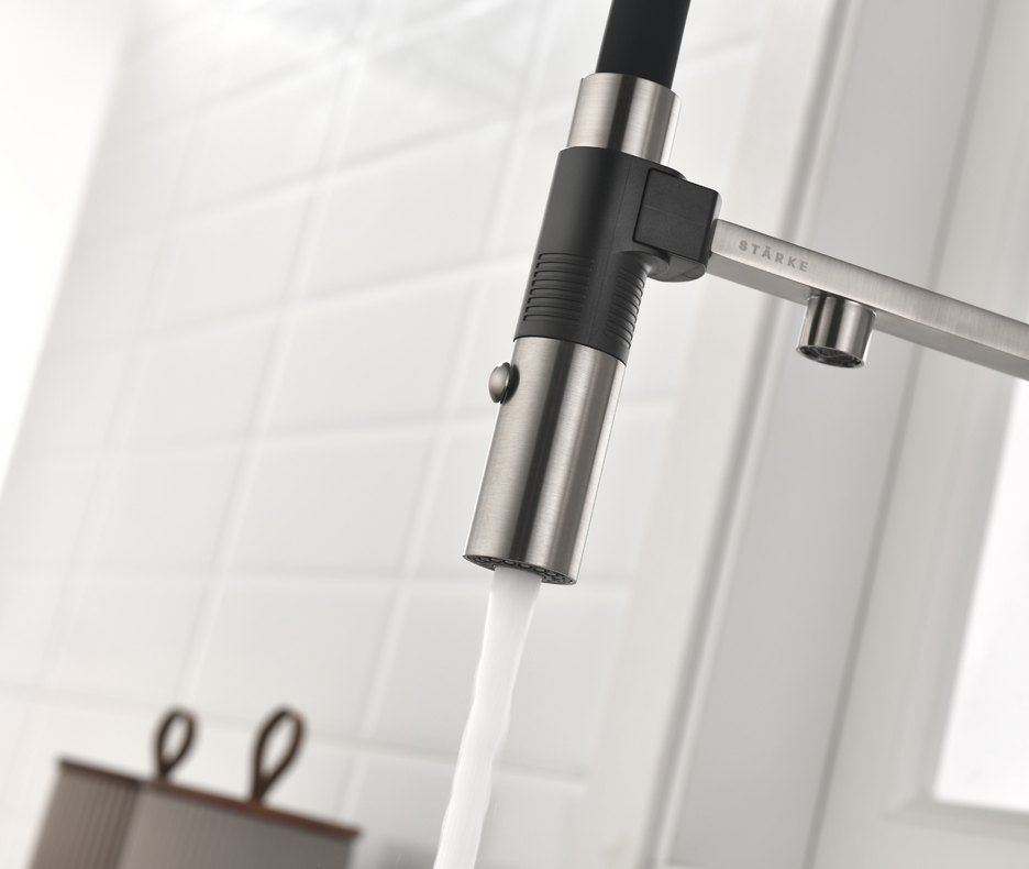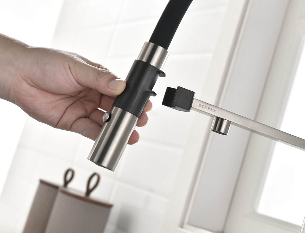 Встроенная в кран насадка на длинном гибком шланге с металлической оплеткой. Насадки с кнопкой могут переключать обычный излив воды на душ.