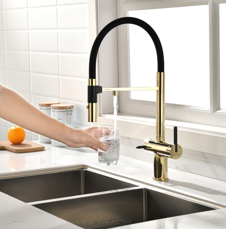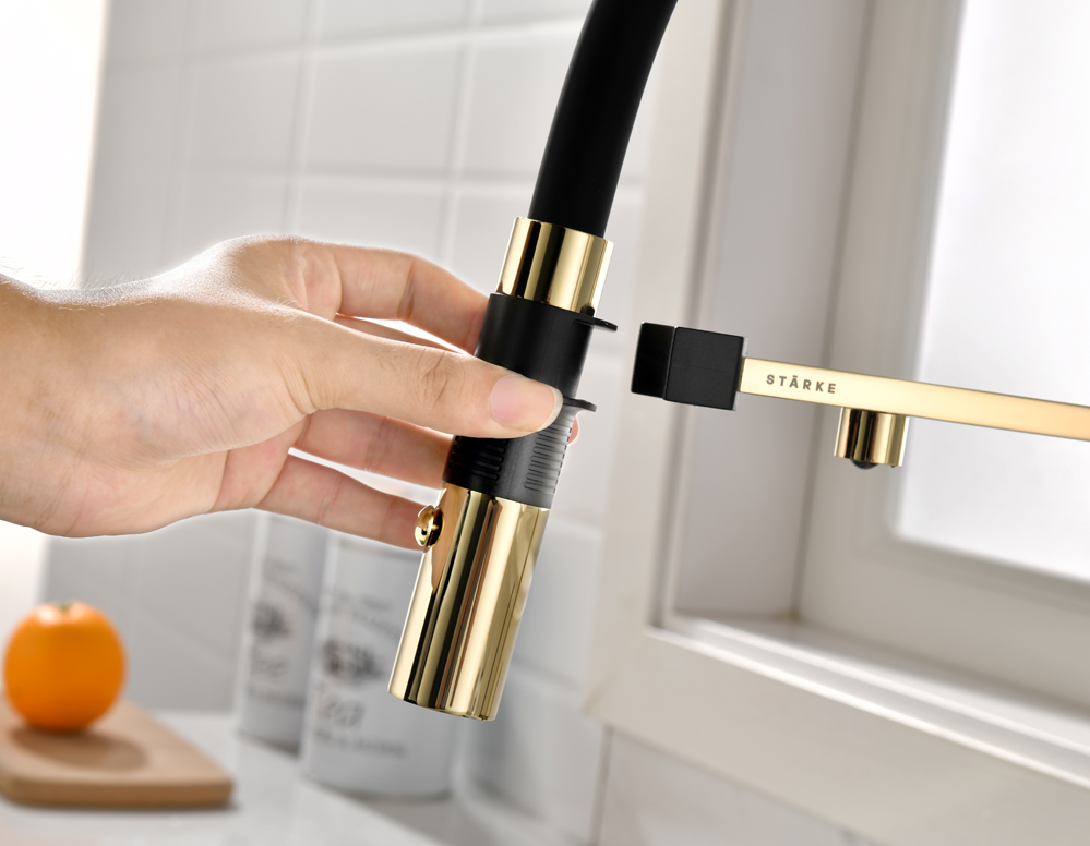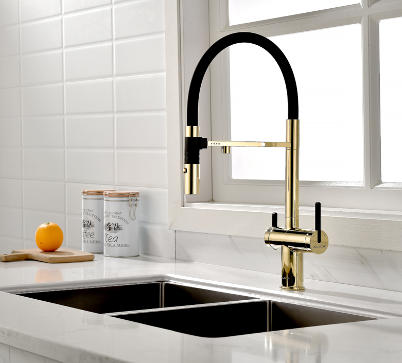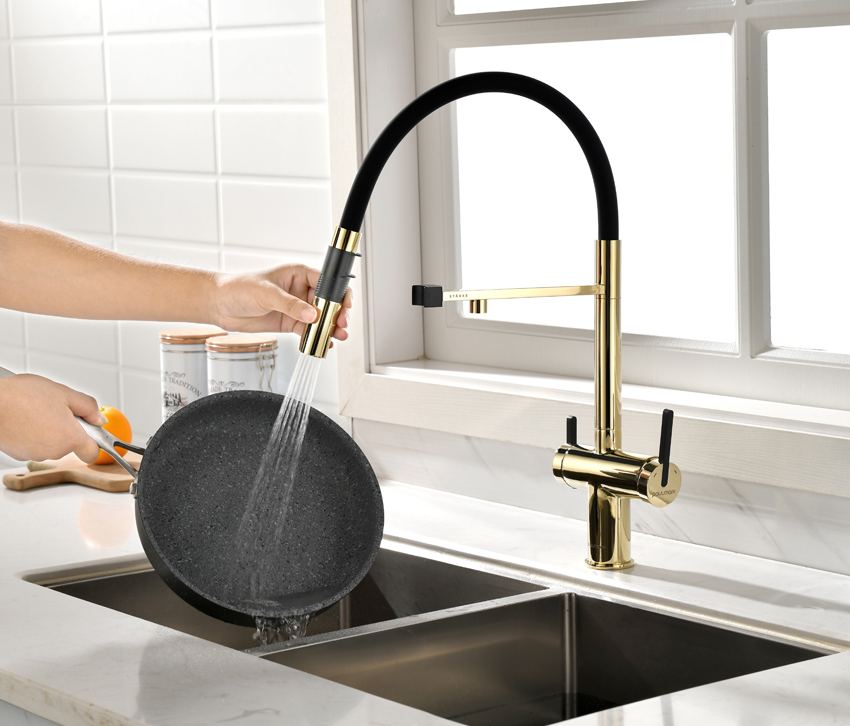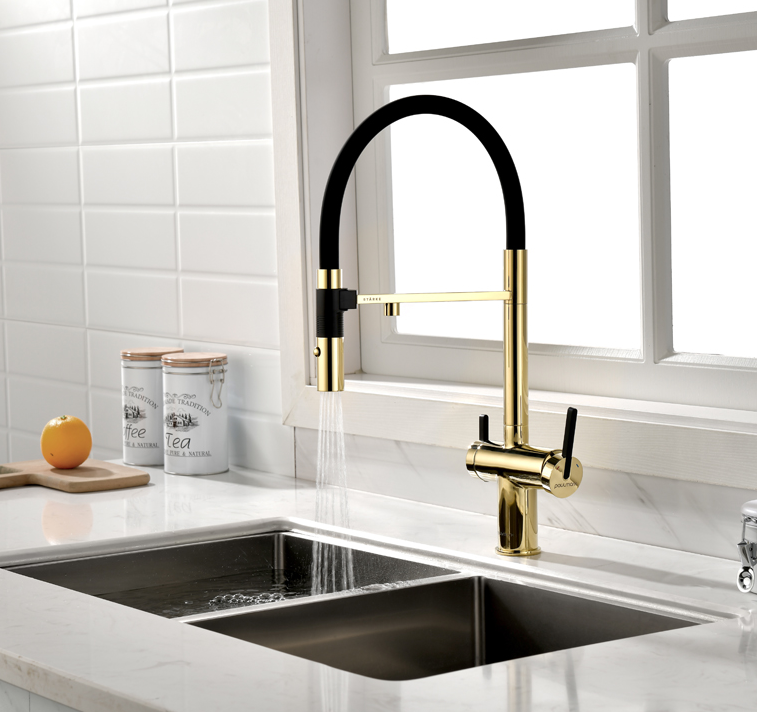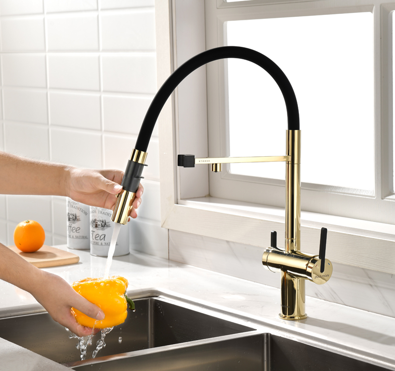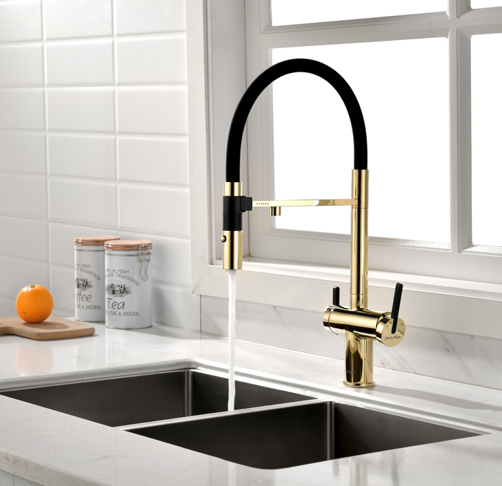 смеситель для кухни, латунь, дополнительный излив для фильтрованной воды, золото, черный шланг