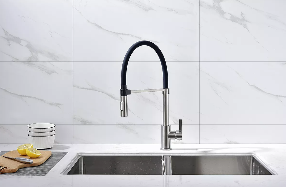 Встроенная в кран насадка на длинном гибком шланге с металлической оплеткой. Насадки с кнопкой могут переключать обычный излив воды на душ.