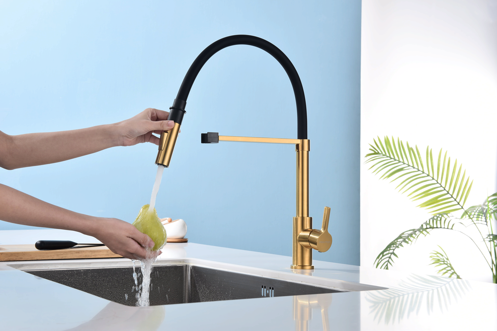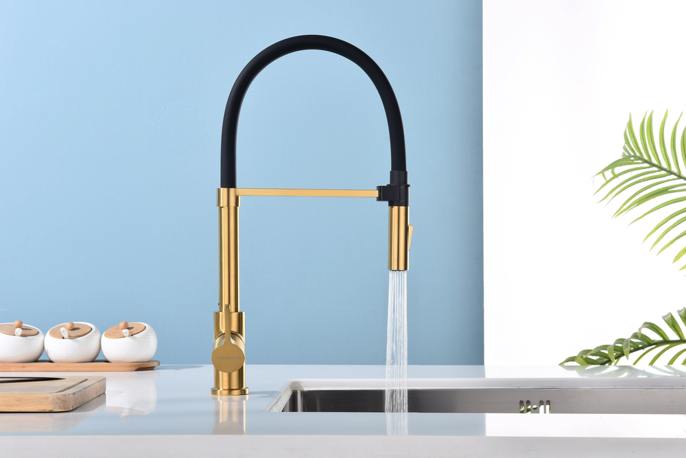 смеситель для кухни, латунь, высокий поворотный гибкий излив, брашированное золото