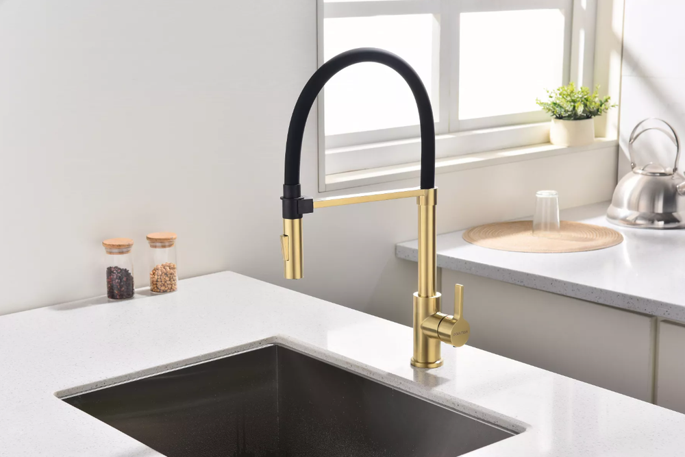 смеситель для кухни, латунь, высокий поворотный гибкий излив, светлое золото