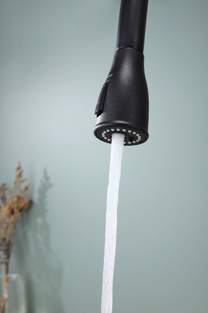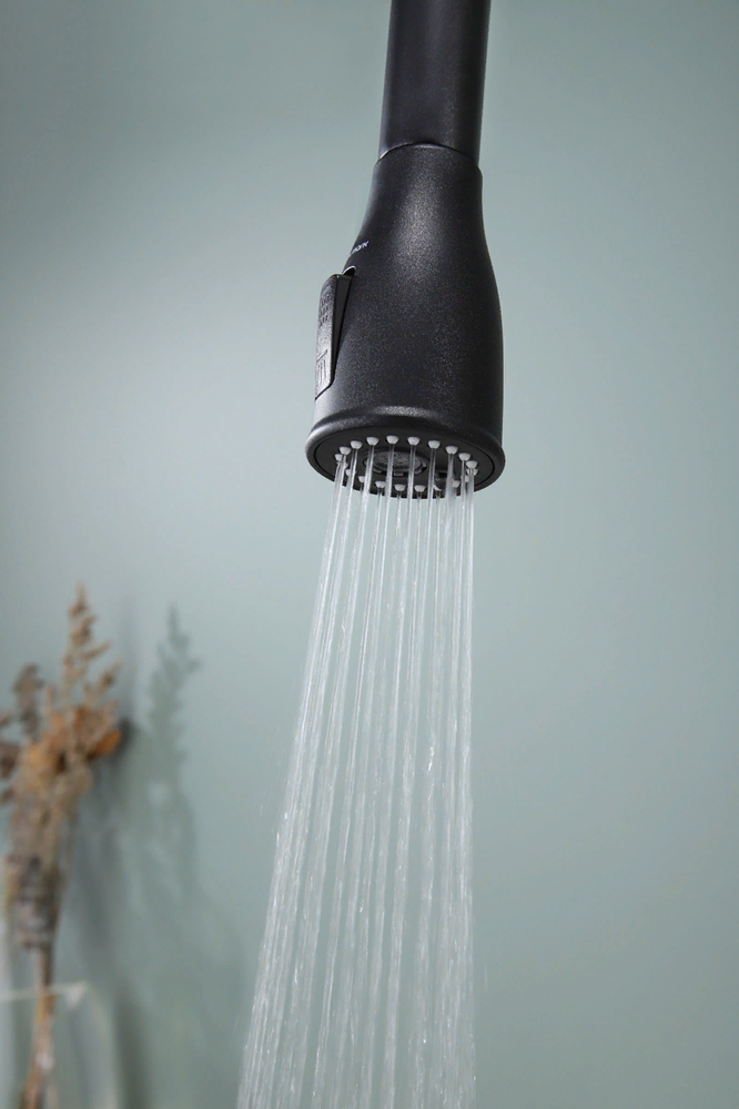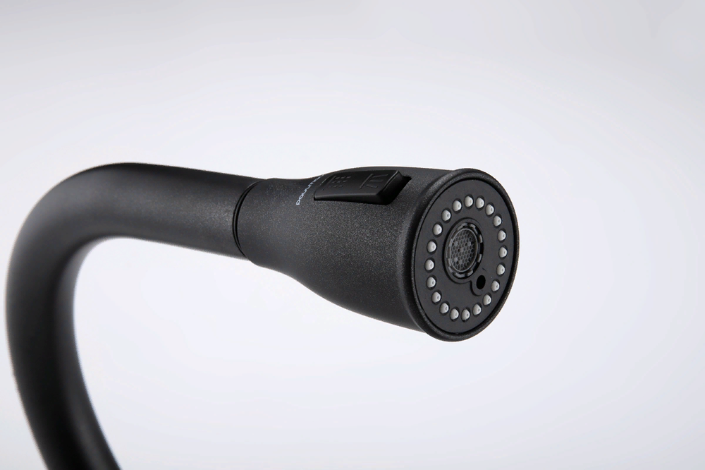 Встроенная в кран насадка на длинном гибком шланге с металлической оплеткой. Насадки с кнопкой могут переключать обычный излив воды на душ.