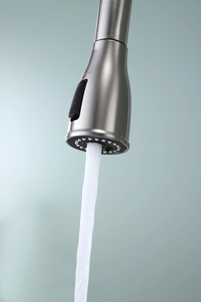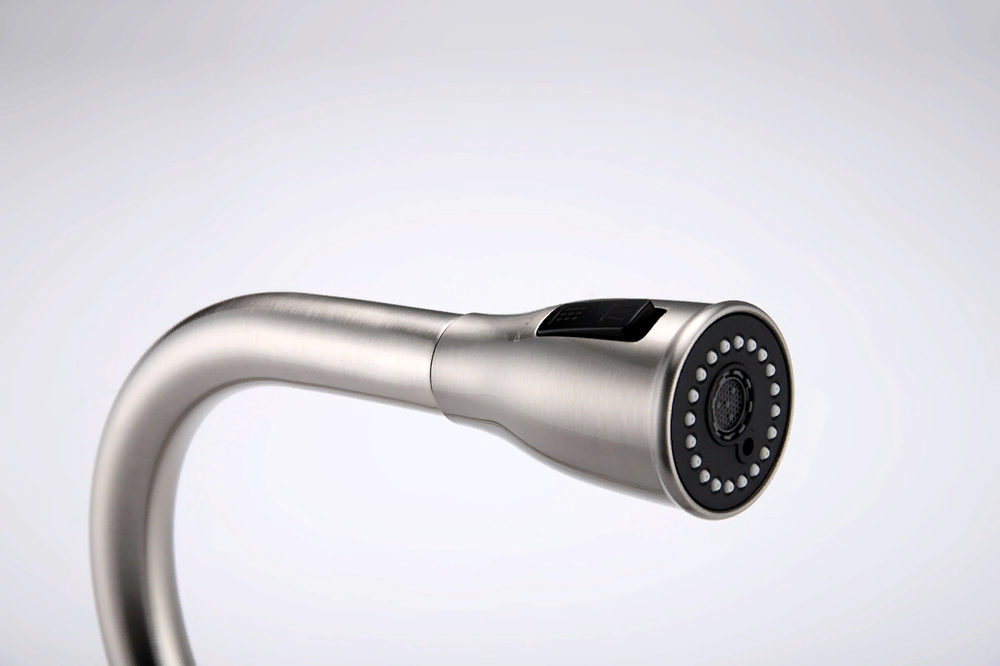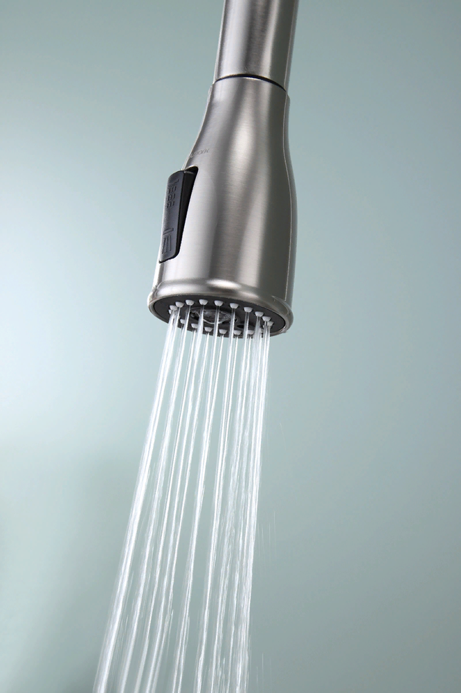 Встроенная в кран насадка на длинном гибком шланге с металлической оплеткой. Насадки с кнопкой могут переключать обычный излив воды на душ.