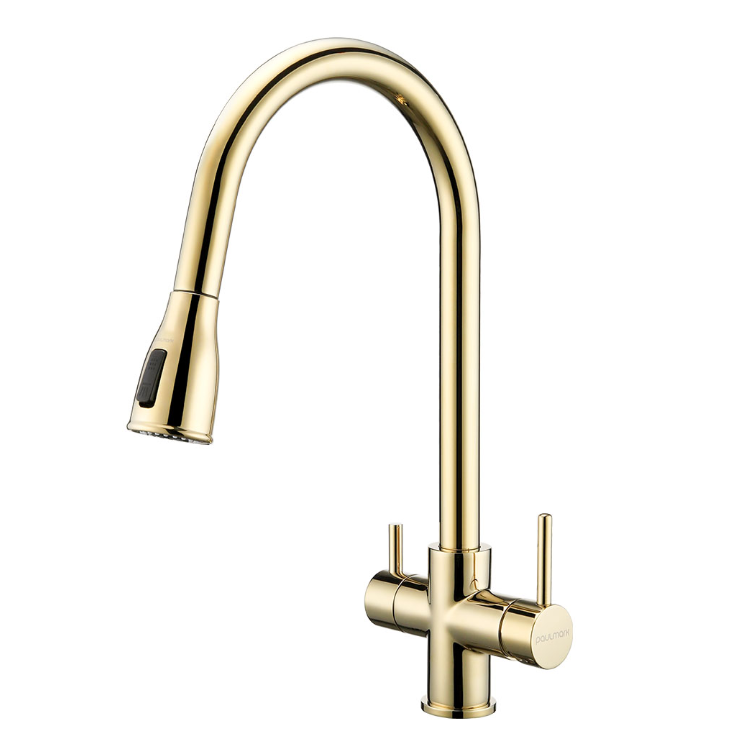 смеситель для кухни, латунь, дополнительный излив для фильтрованной воды, светлое брашированное золото