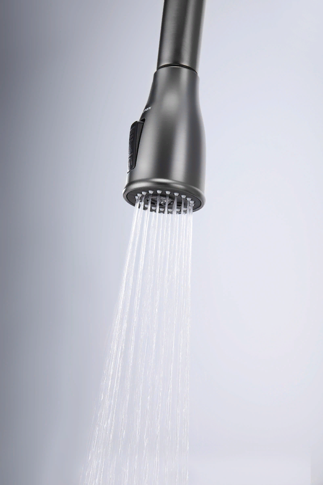 Встроенная в кран насадка на длинном гибком шланге с металлической оплеткой. Насадки с кнопкой могут переключать обычный излив воды на душ.