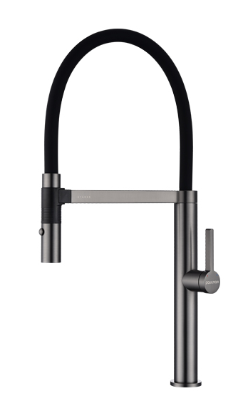 Встроенная в кран насадка на длинном гибком шланге с металлической оплеткой. Насадки с кнопкой могут переключать обычный излив воды на душ.