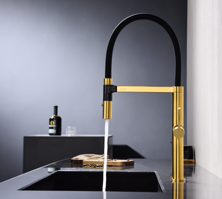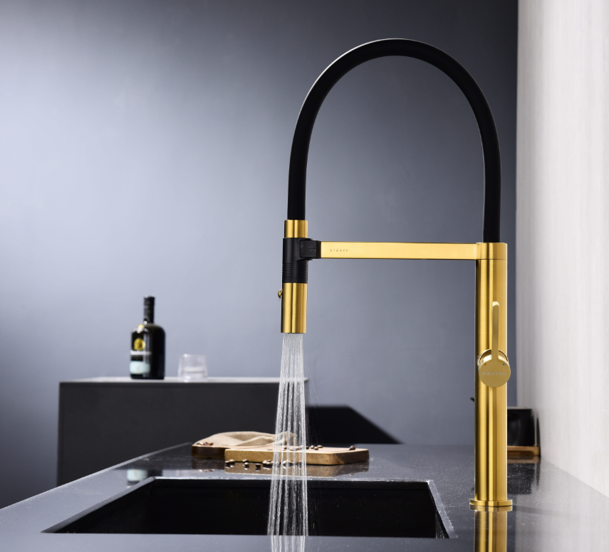 смеситель для кухни, латунь, высокий поворотный гибкий излив, брашированное золото