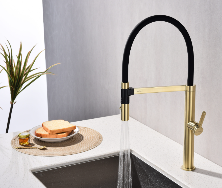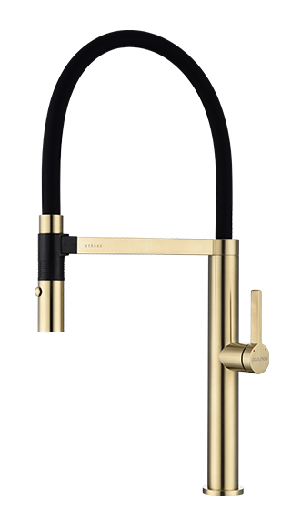 смеситель для кухни, латунь, высокий поворотный гибкий излив, светлое брашированное золото