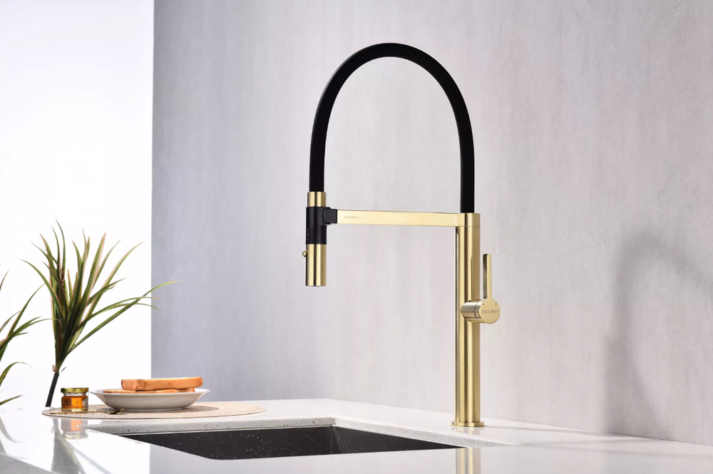 смеситель для кухни, латунь, высокий поворотный гибкий излив, светлое золото