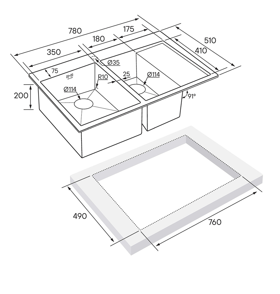 Расстояние от дна до верхней кромки чаши мойки. Оптимальная глубина — 15-18 см. Чем глубже мойка, тем меньше брызг попадет наружу.