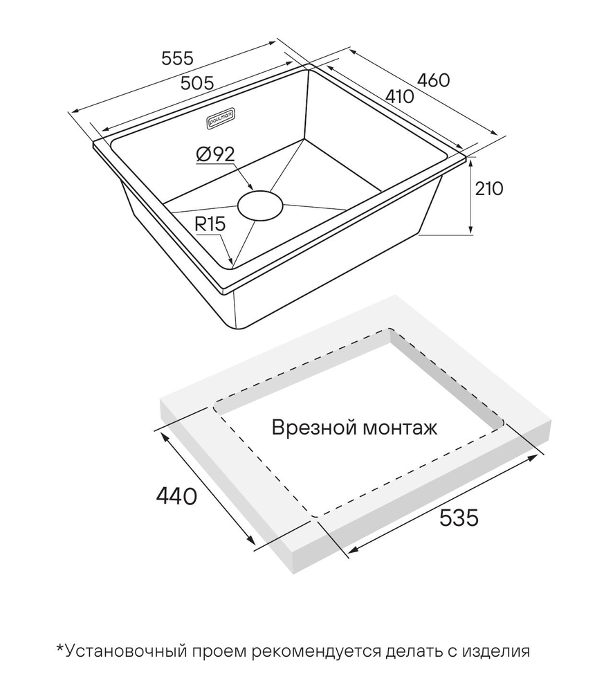 Расстояние от дна до верхней кромки чаши мойки. Оптимальная глубина — 15-18 см. Чем глубже мойка, тем меньше брызг попадет наружу.