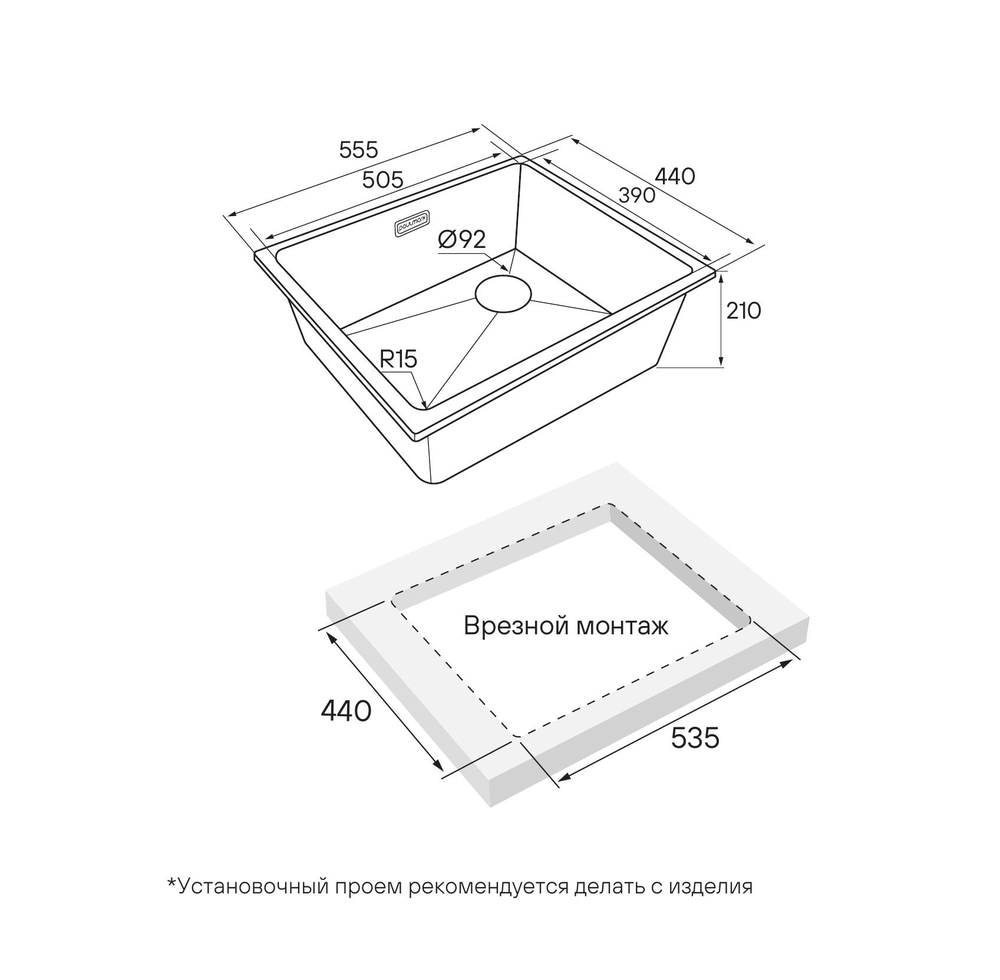 Расстояние от дна до верхней кромки чаши мойки. Оптимальная глубина — 15-18 см. Чем глубже мойка, тем меньше брызг попадет наружу.