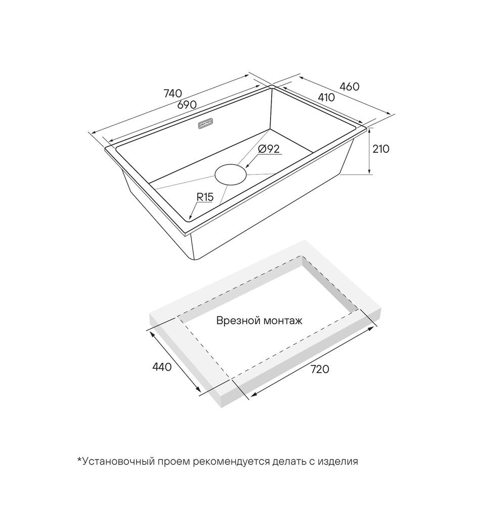 Расстояние от дна до верхней кромки чаши мойки. Оптимальная глубина — 15-18 см. Чем глубже мойка, тем меньше брызг попадет наружу.