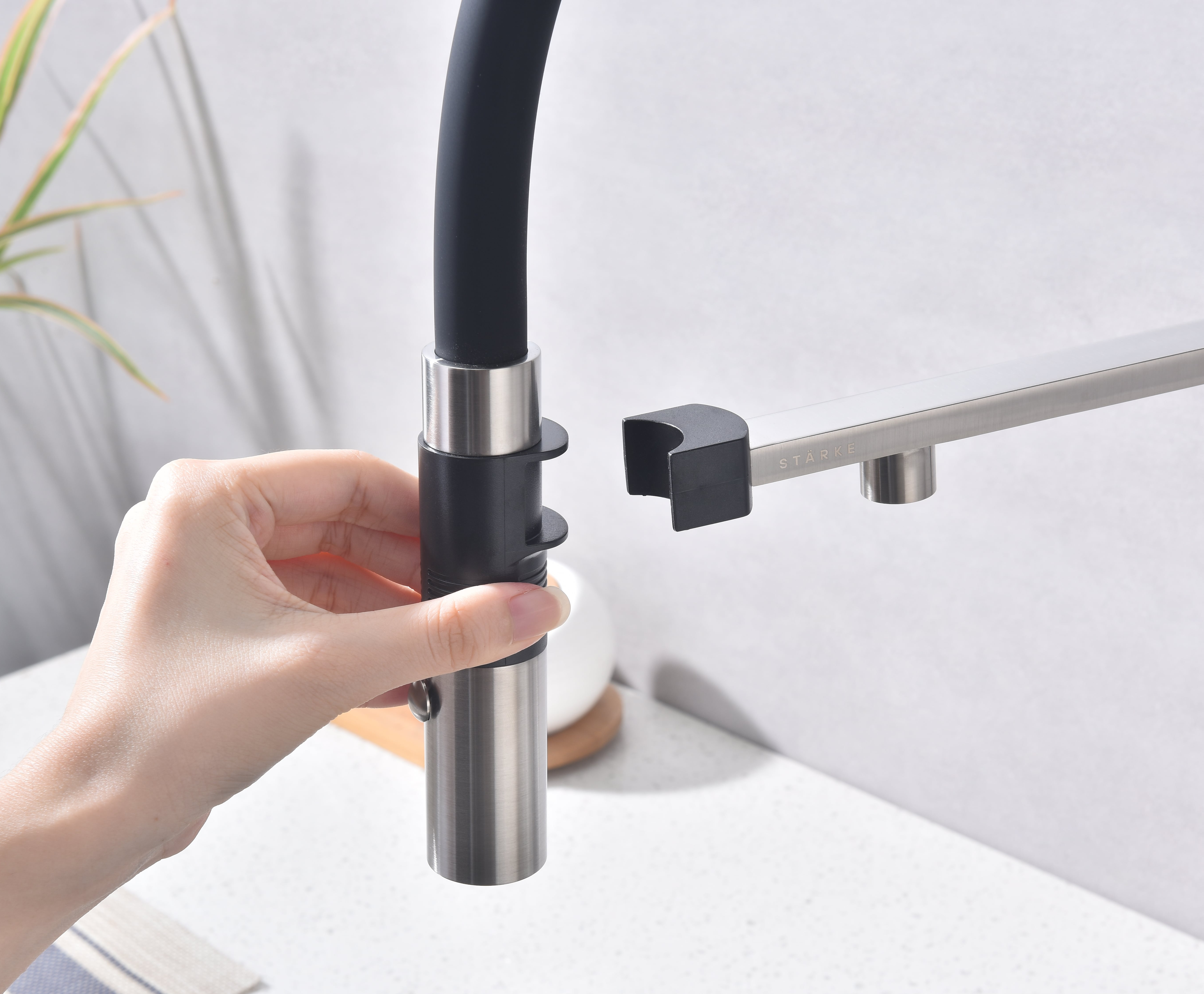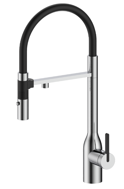 Встроенная в кран насадка на длинном гибком шланге с металлической оплеткой. Насадки с кнопкой могут переключать обычный излив воды на душ.