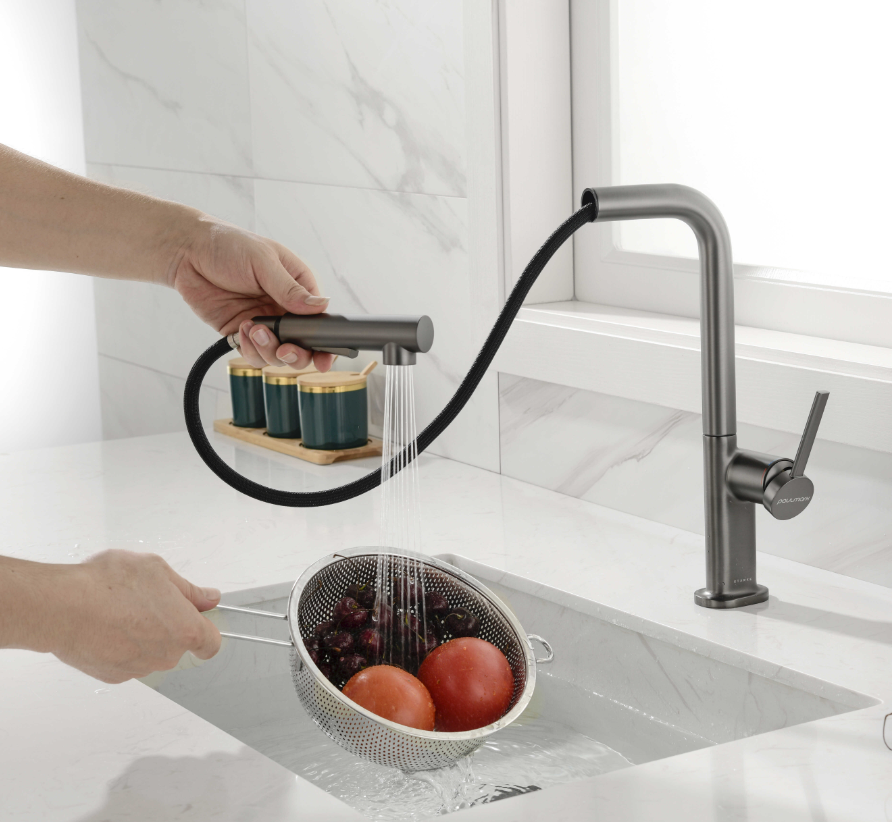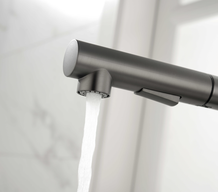 Встроенная в кран насадка на длинном гибком шланге с металлической оплеткой. Насадки с кнопкой могут переключать обычный излив воды на душ.