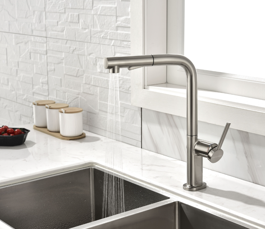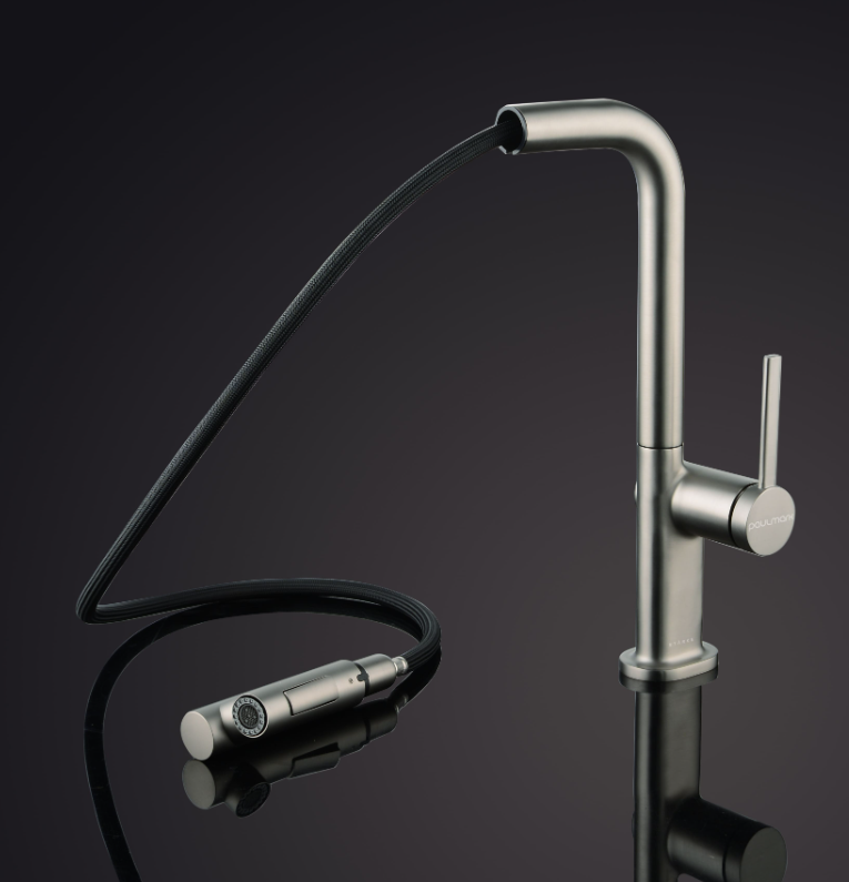 Встроенная в кран насадка на длинном гибком шланге с металлической оплеткой. Насадки с кнопкой могут переключать обычный излив воды на душ.