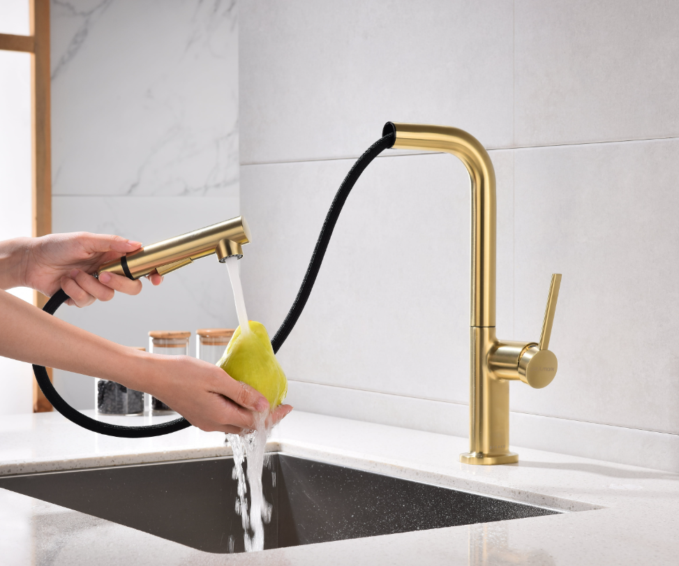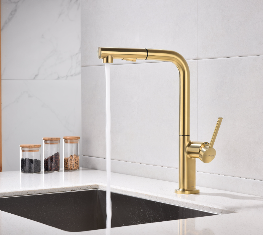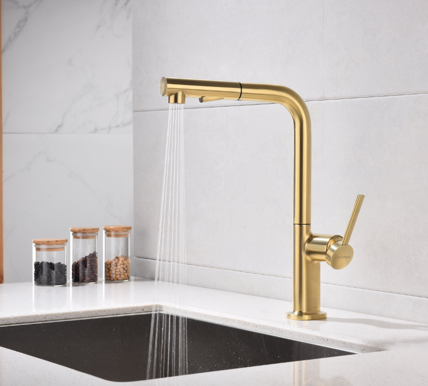 смеситель для кухни, латунь, высокий поворотный излив, светлое брашированное золото