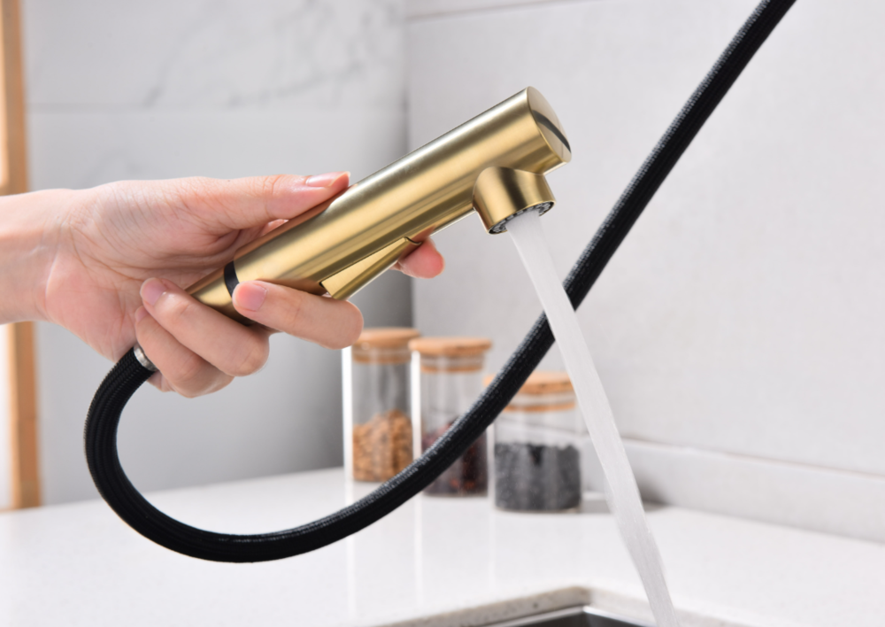 Встроенная в кран насадка на длинном гибком шланге с металлической оплеткой. Насадки с кнопкой могут переключать обычный излив воды на душ.
