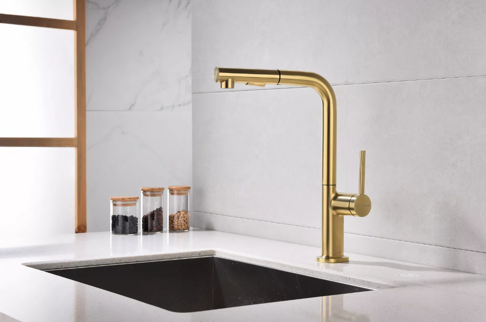 смеситель для кухни, латунь, высокий поворотный излив, светлое золото