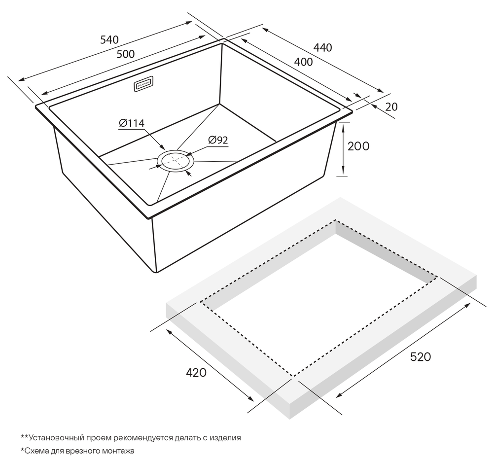 мойка, нержавеющая сталь, 540х440 мм, нержавеющая сталь