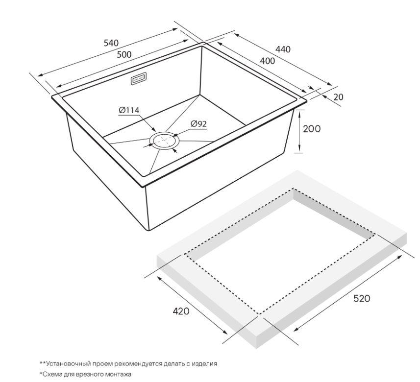 мойка, нержавеющая сталь, 540х440 мм, вороненная сталь