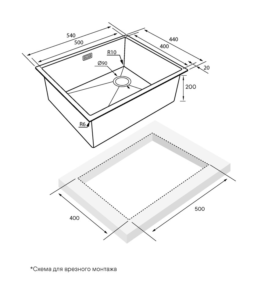 мойка, нержавеющая сталь, 540х440 мм, матовый серый