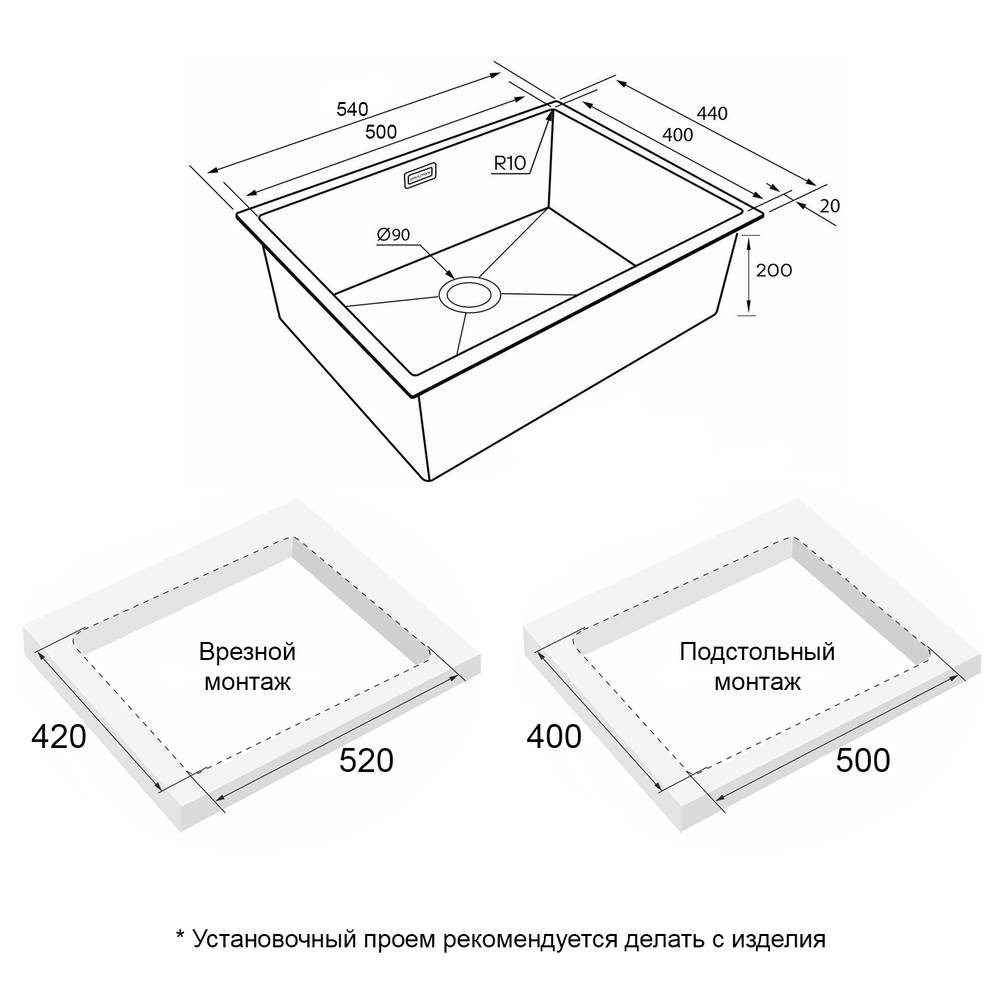 мойка, нержавеющая сталь, 540х440 мм, матовый черный