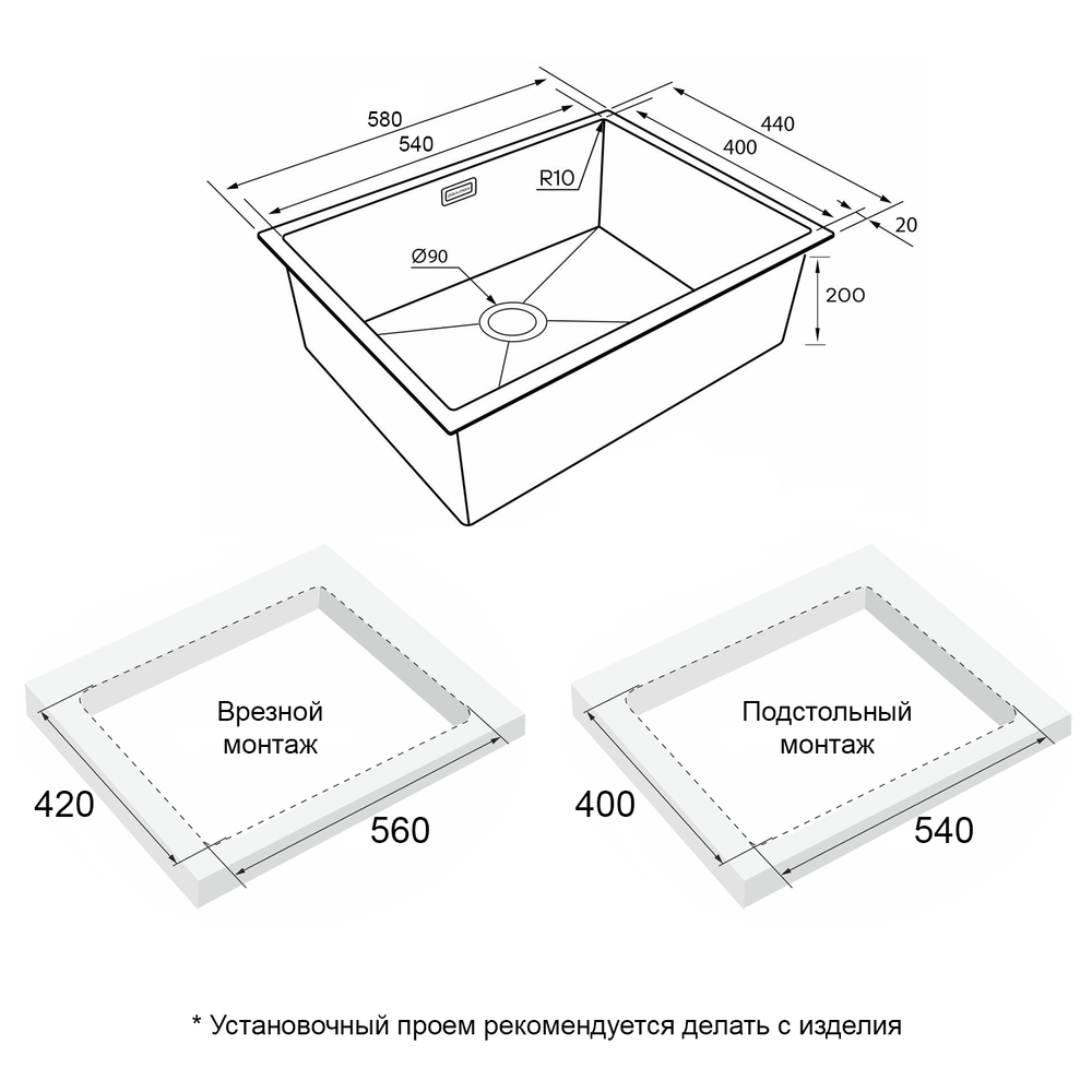 Расстояние от дна до верхней кромки чаши мойки. Оптимальная глубина — 15-18 см. Чем глубже мойка, тем меньше брызг попадет наружу.