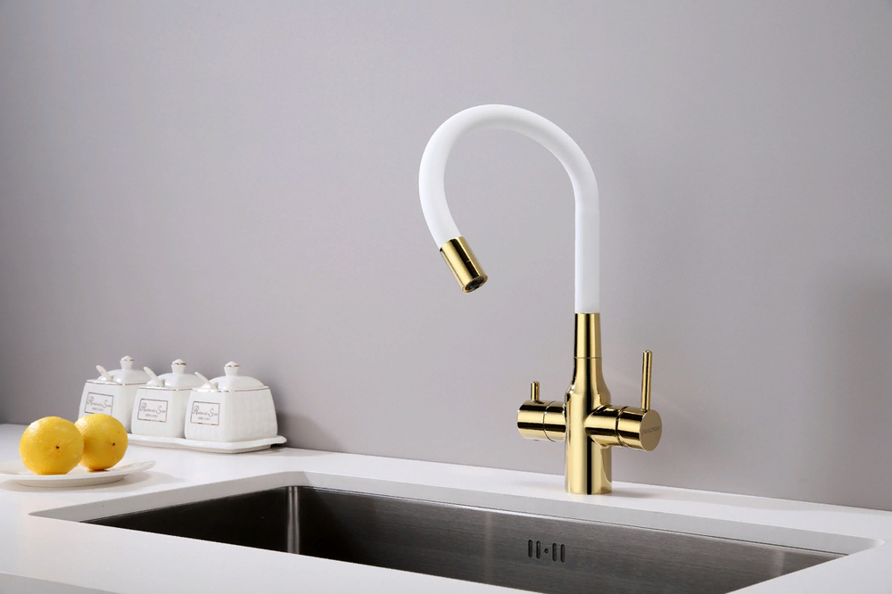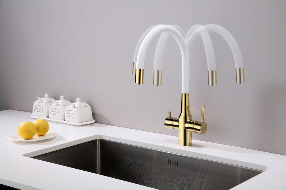 смеситель для кухни, латунь, дополнительный излив для фильтрованной воды, золото, белый шланг