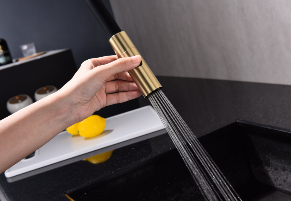 Встроенная в кран насадка на длинном гибком шланге с металлической оплеткой. Насадки с кнопкой могут переключать обычный излив воды на душ.