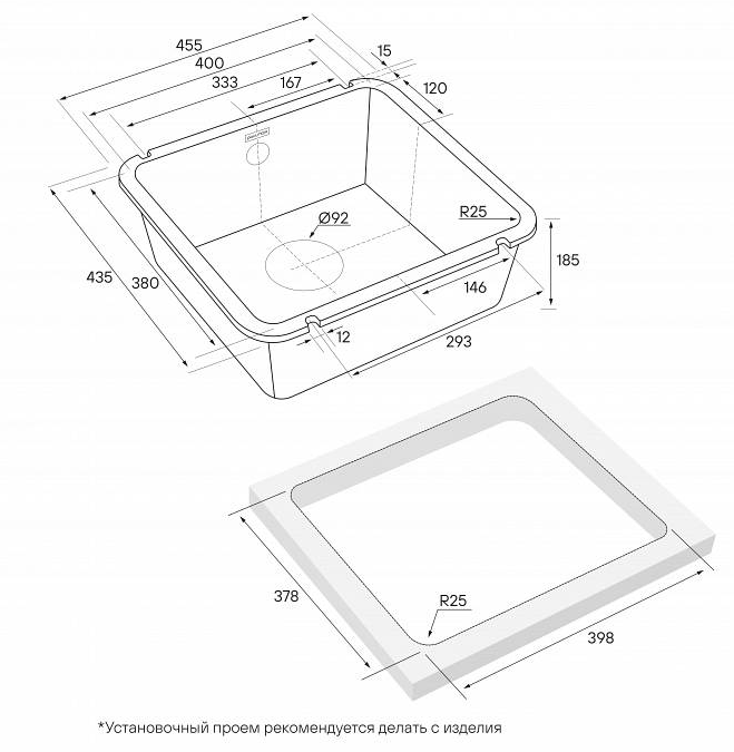 Расстояние от дна до верхней кромки чаши мойки. Оптимальная глубина — 15-18 см. Чем глубже мойка, тем меньше брызг попадет наружу.