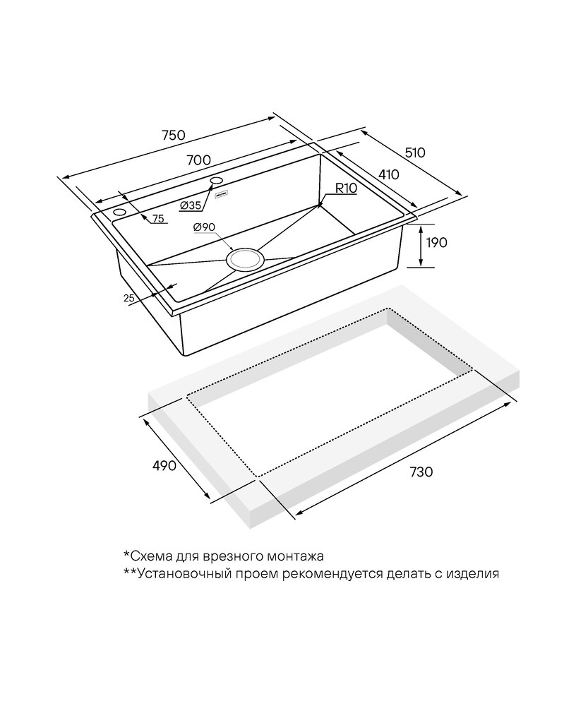 мойка, нержавеющая сталь, 750х510 мм, нержавеющая брашированная сталь