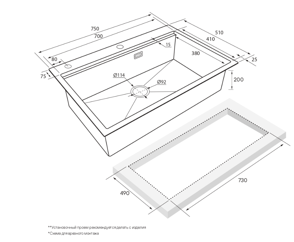 мойка, нержавеющая сталь, 750х510 мм, нержавеющая сталь брашированная