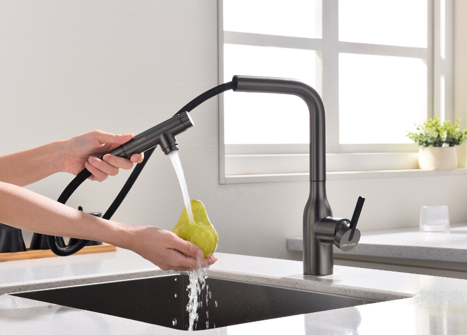 Встроенная в кран насадка на длинном гибком шланге с металлической оплеткой. Насадки с кнопкой могут переключать обычный излив воды на душ.