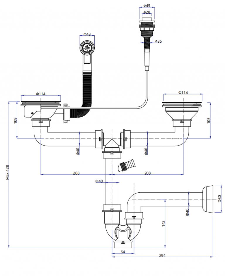 сливная арматура для одночашевых моек RINOX с прямоугольным переливом, декоративной крышкой и корзинчатый вентиль (90 мм), черный