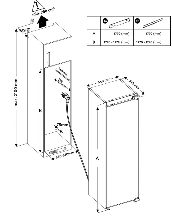 морозильник встраиваемый, 197 л, класс энергопотребления А+, No Frost, 54x54,5x177 см, белый