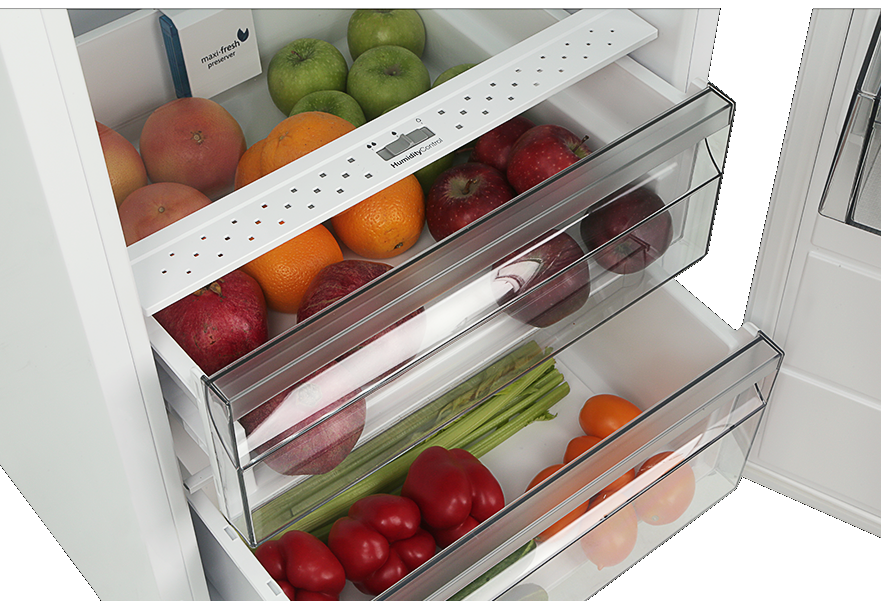 Технология контроля влажности и зона свежести обеспечивают длительное сохранение свежести овощей и фруктов.