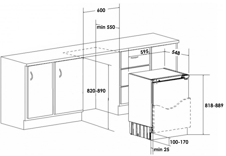 холодильник однокамерный встраиваемый под столешницу, 133 л, класс энергопотребления А+, капельная система размораживания, 59,5х54,8х81,8 см