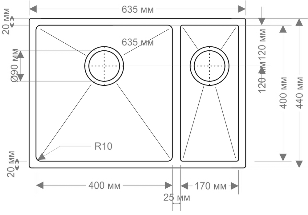 мойка, нержавеющая сталь, 635x440 мм, нержавеющая сталь