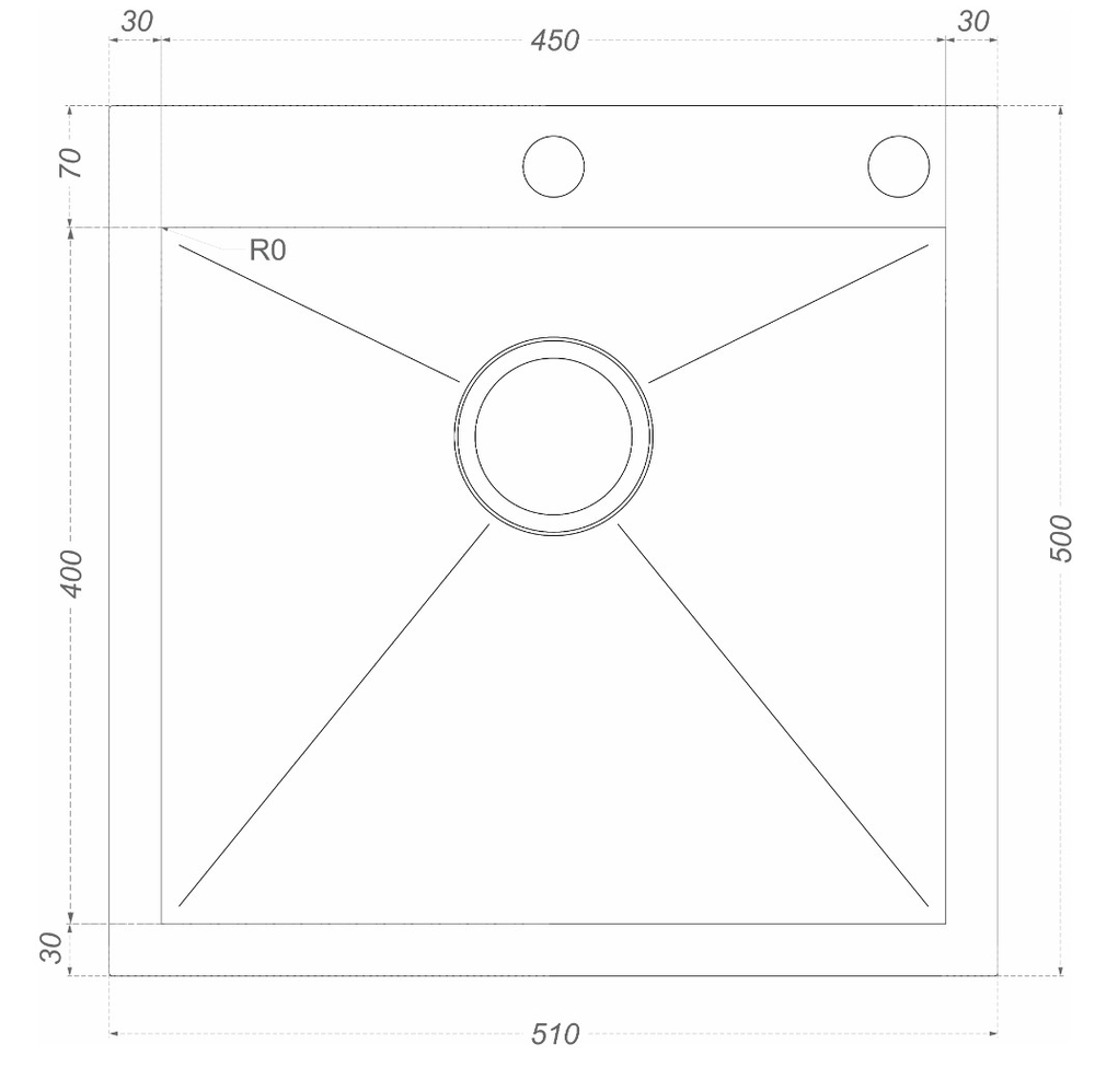мойка, нержавеющая сталь, 510x500 мм, нержавеющая сталь сатин (с вентиль-автоматом)