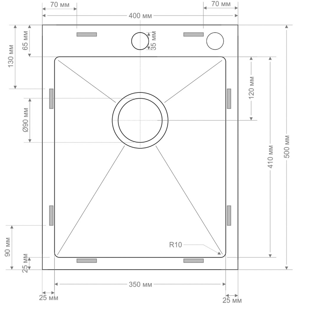 Расстояние от дна до верхней кромки чаши мойки. Оптимальная глубина — 15-18 см. Чем глубже мойка, тем меньше брызг попадет наружу.