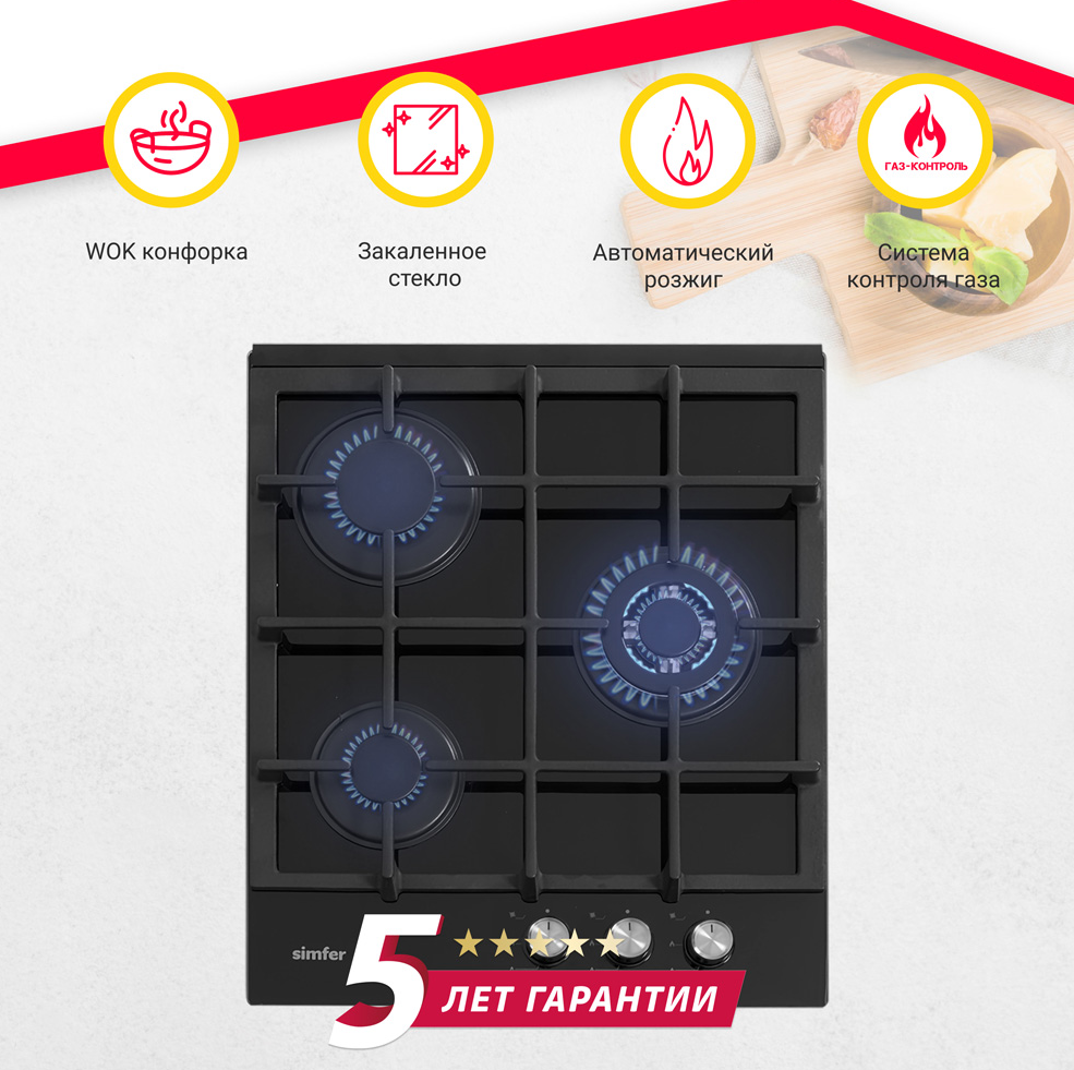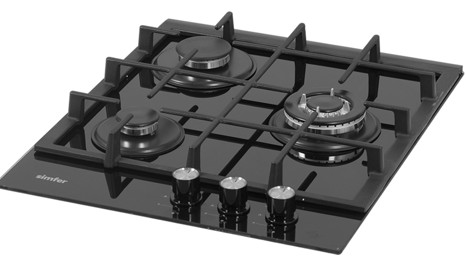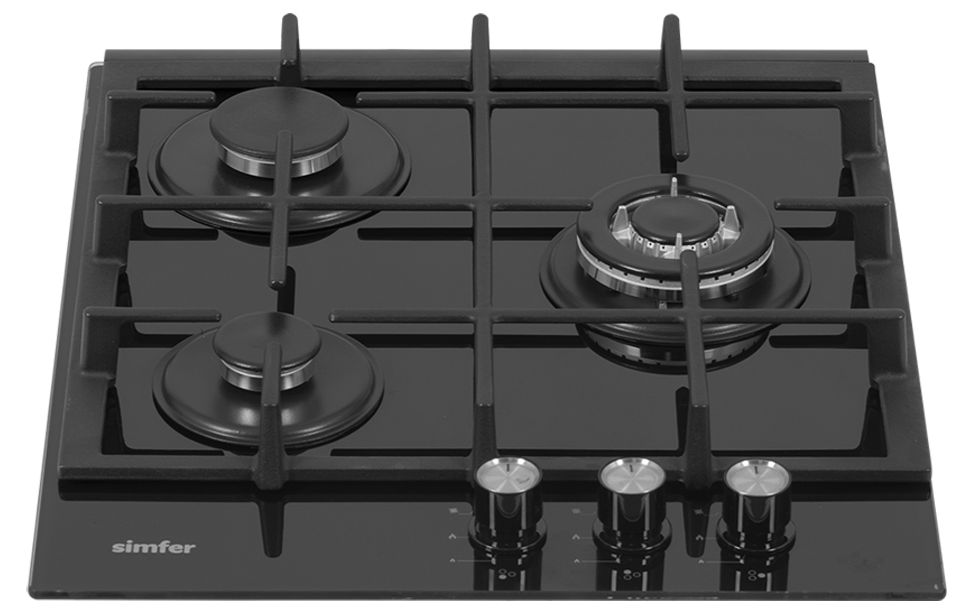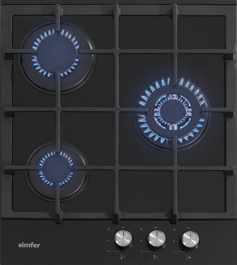 поверхность газовая, 45 см, газ на стекле, 3 конфорки, решетки чугунные, черный