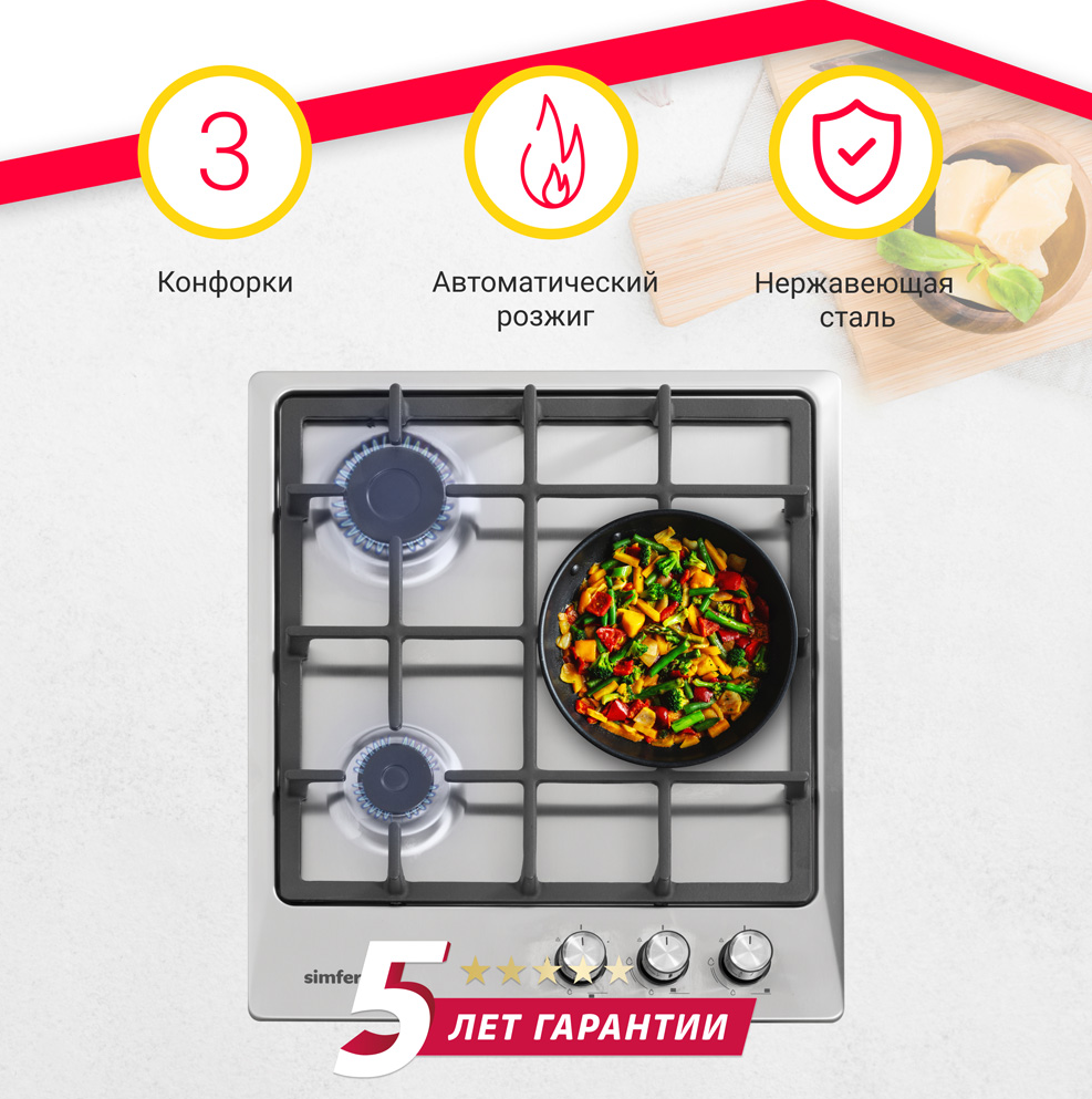 поверхность газовая, 45 см, газ на металле, 3 конфорки, решетка чугунная, нержавеющая сталь