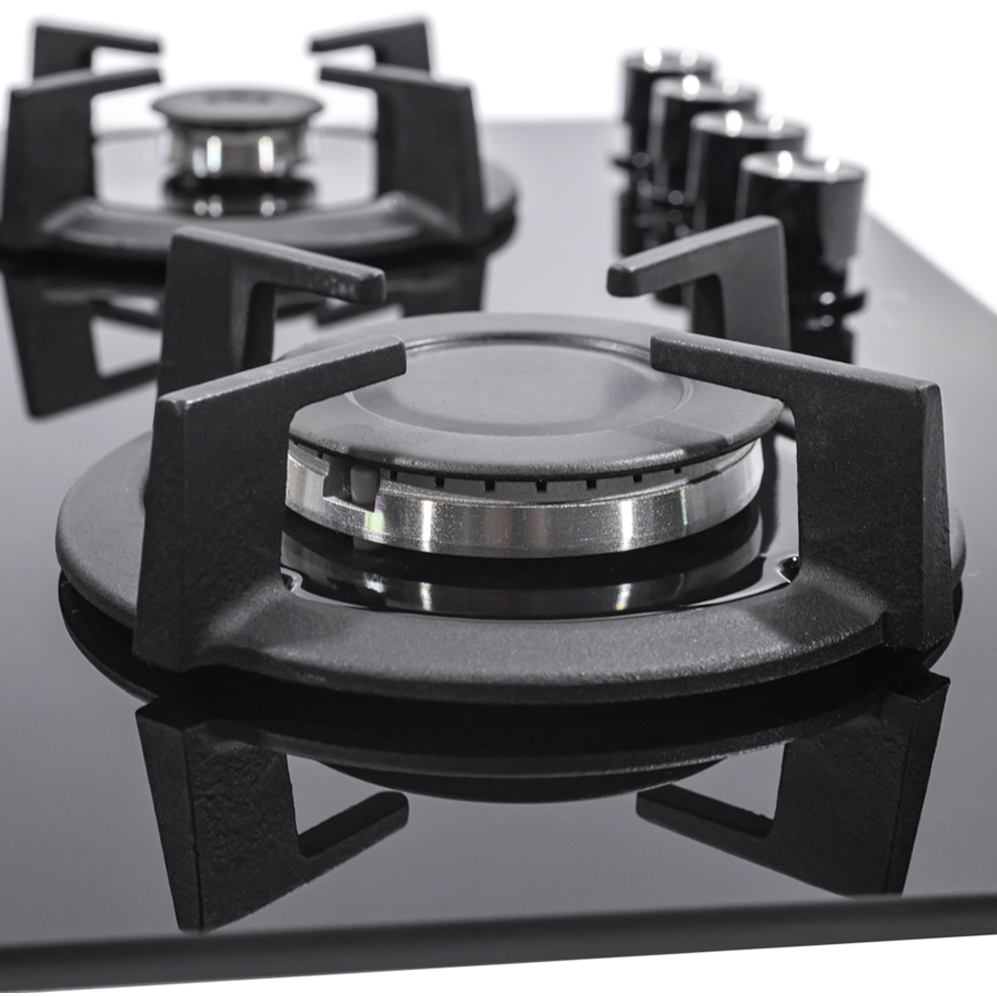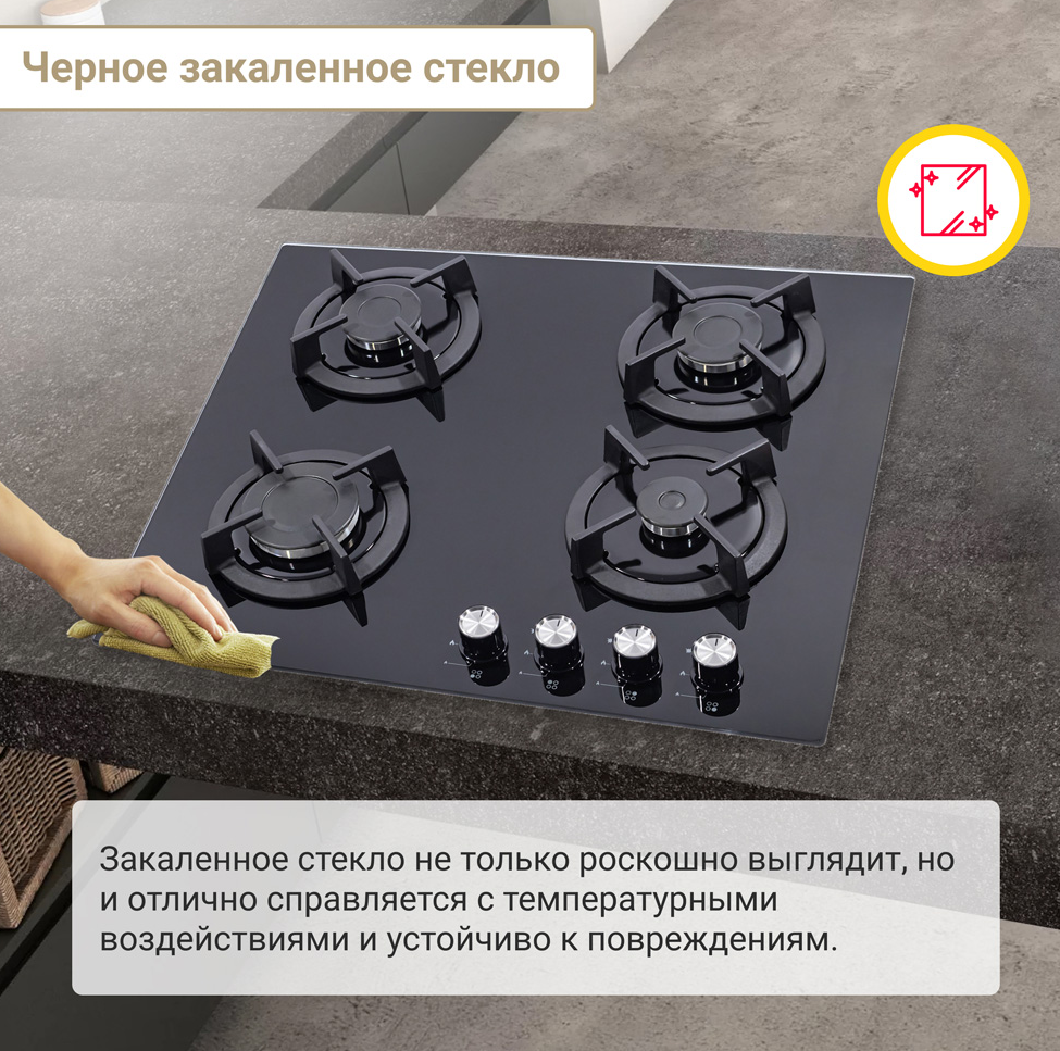 поверхность газовая, 60 см, газ на стекле, 4 конфорки, решетки чугунные, черный