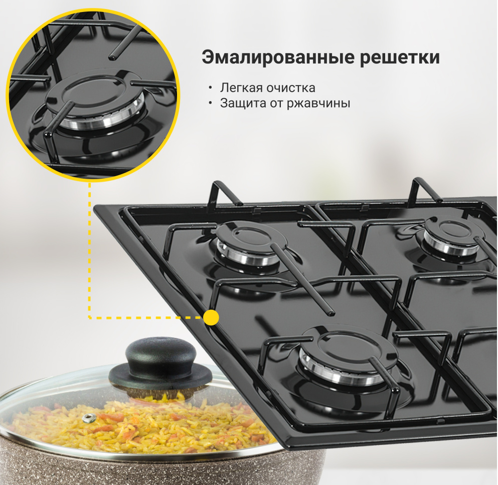 поверхность газовая, 60 см, газ на эмали, 4 конфорки, решетки эмалированные, черный