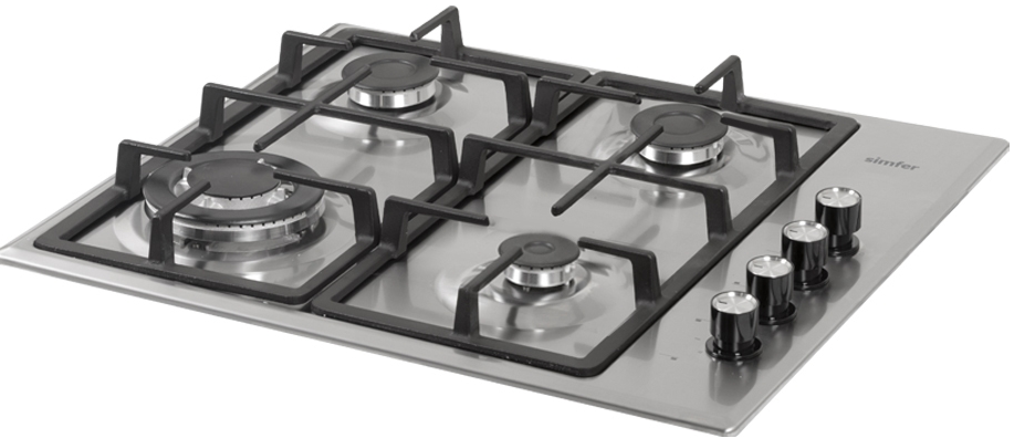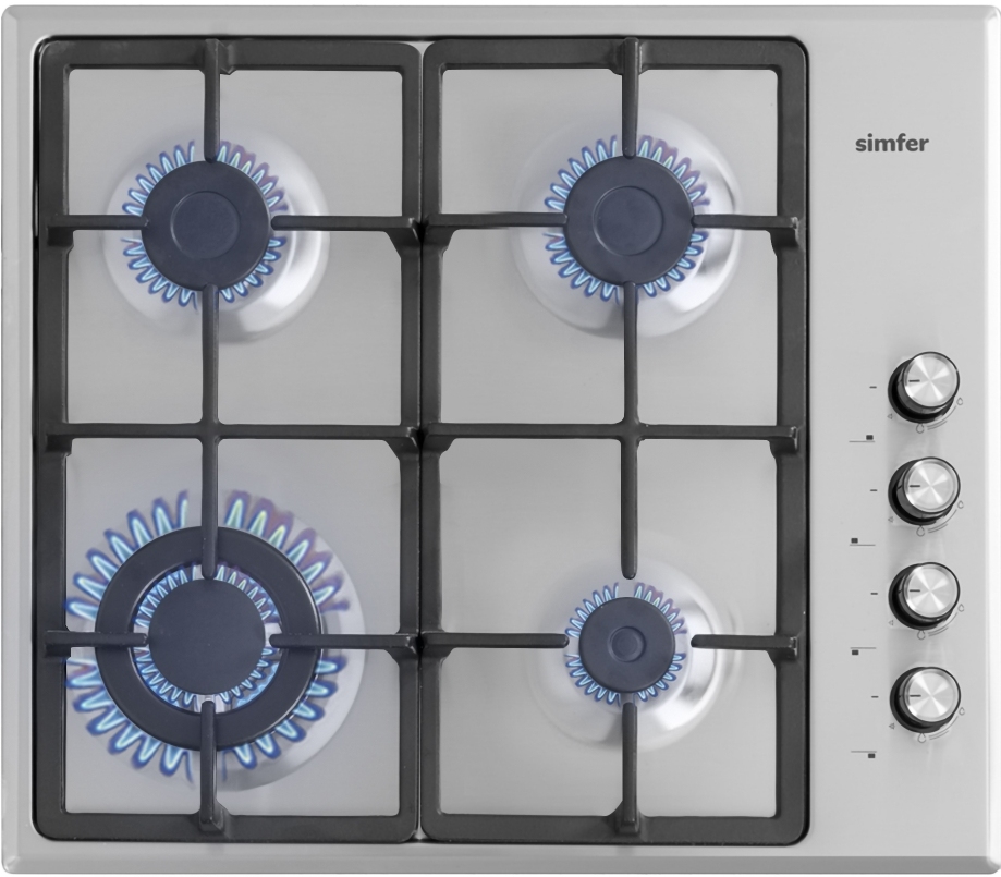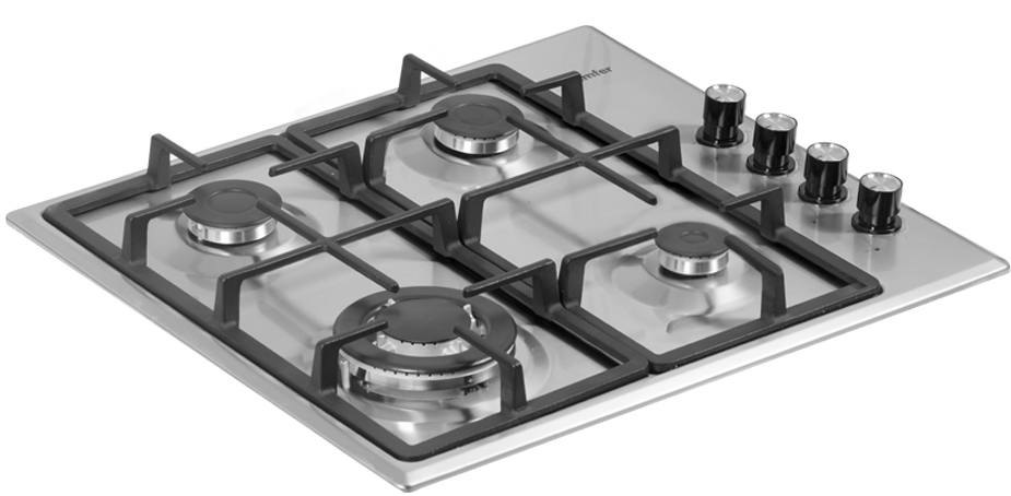 поверхность газовая, 60 см, газ на металле, 4 конфорки, решетки чугунные, нержавеющая сталь