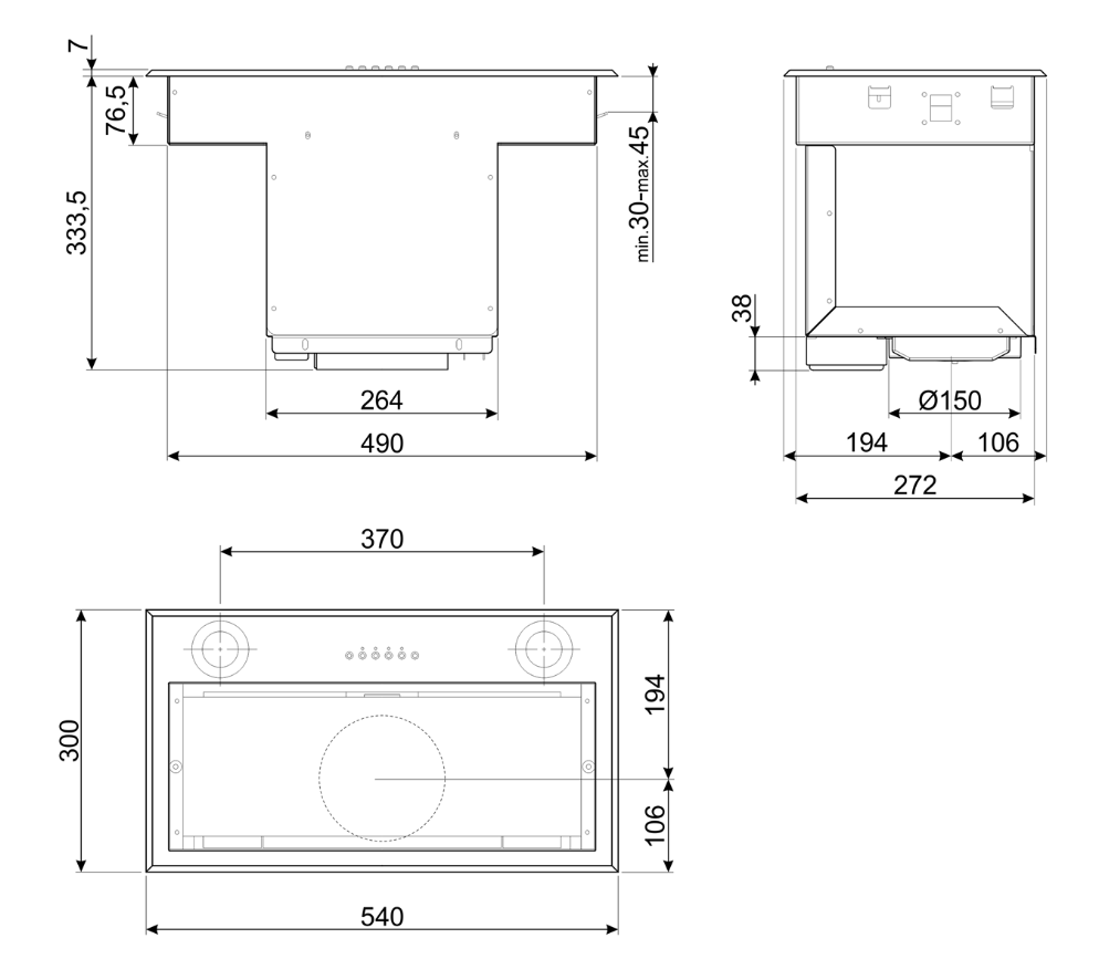 вытяжка встраиваемая в подвесной шкаф, 54 см, 683 м3/ч, нержавеющая сталь