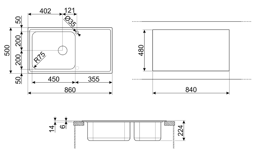 мойка, нержавеющая сталь, 860х500 мм, нержавеющая сталь матовая