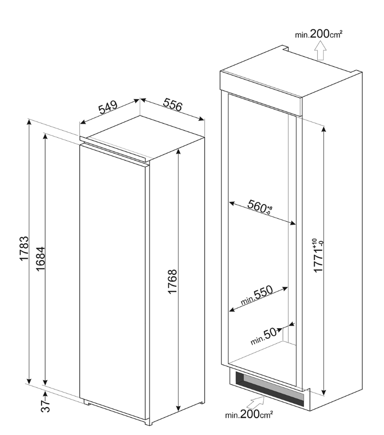 холодильник однокамерный встраиваемый, 310 л, класс энергопотребления E, капельная система размораживания, 54,8x54,9x177,2 см
