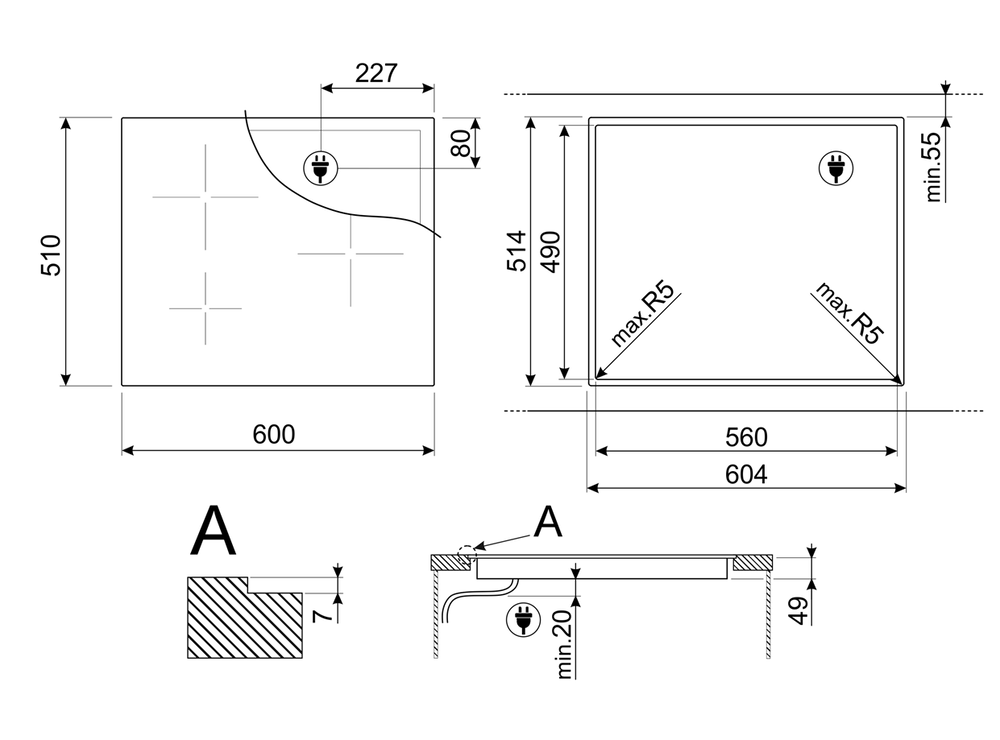 Характер огранки фаски на внешней стороне варочной панели. Металлические рамки предотвращают забивание монтажных швов крошками и пылью.